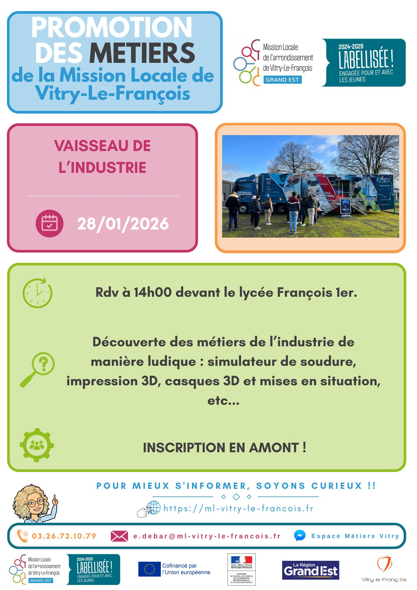 Le mercredi 28 janvier, la Mission Locale t’emmène découvrir les métiers de l’industrie de façon ludique et interactive : 🔧 simulateur de soudure 🖨️ impression 3D 🥽 casques 3D 🎯 mises en situation, et bien plus encore !